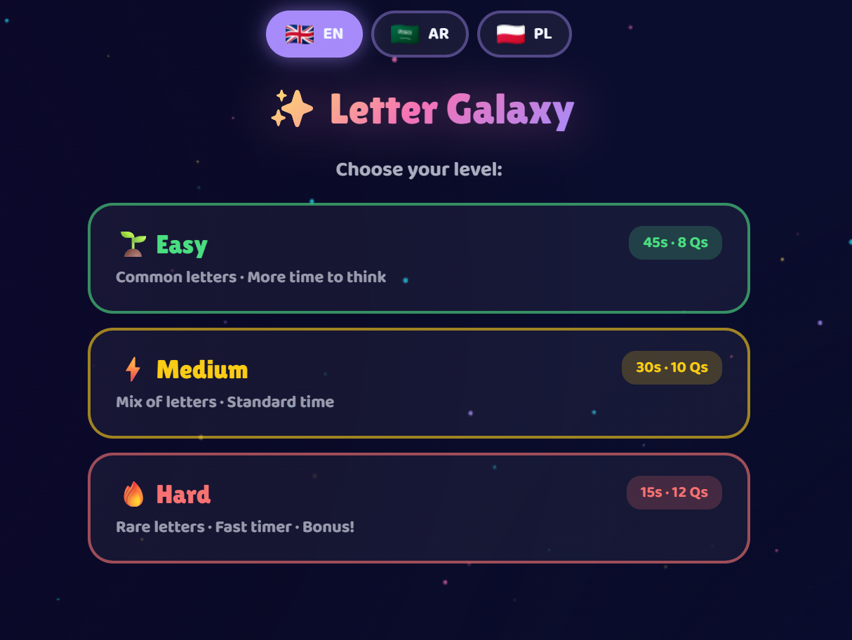 A space-themed alphabet adventure where kids blast through the galaxy matching letters, identifying uppercase and lowercase, and building phonics awareness. Each correct answer sends them deeper into the stars. Designed for ages 5–8, it strengthens letter recognition, early reading foundations, and spelling instincts through fast-paced, reward-driven play. The streak multiplier system encourages kids to stay focused and build momentum.