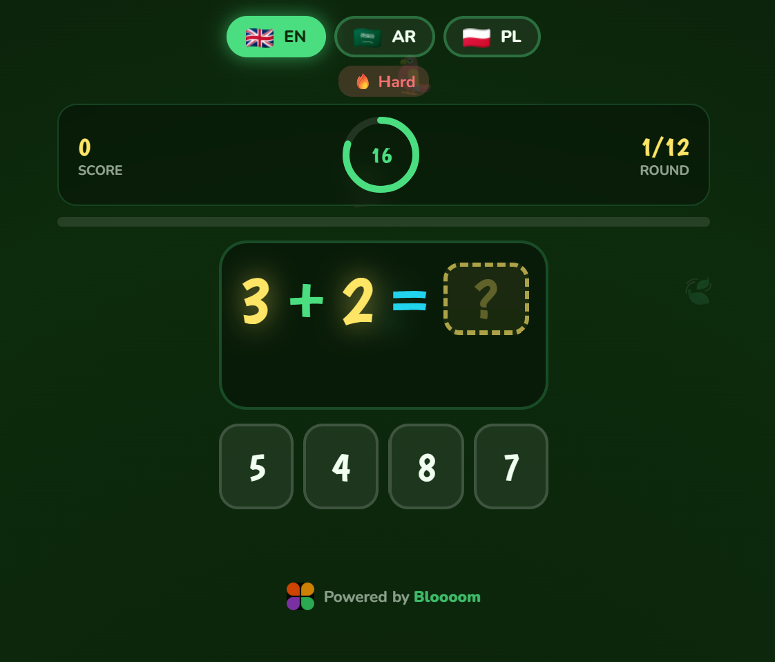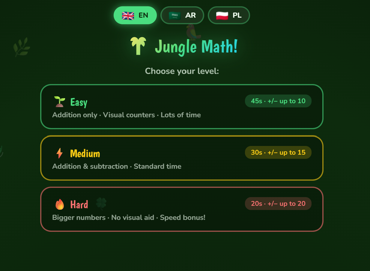 A lush jungle adventure that turns addition and subtraction into an exciting expedition. Kids solve math problems surrounded by animated trees, fruits, and jungle sounds, using visual counters to support understanding. Ideal for ages 6–8, it reinforces number sense, mental arithmetic, and problem-solving speed. The countdown timer builds healthy pressure to think quickly, while visual fruit aids ensure no child is left behind.