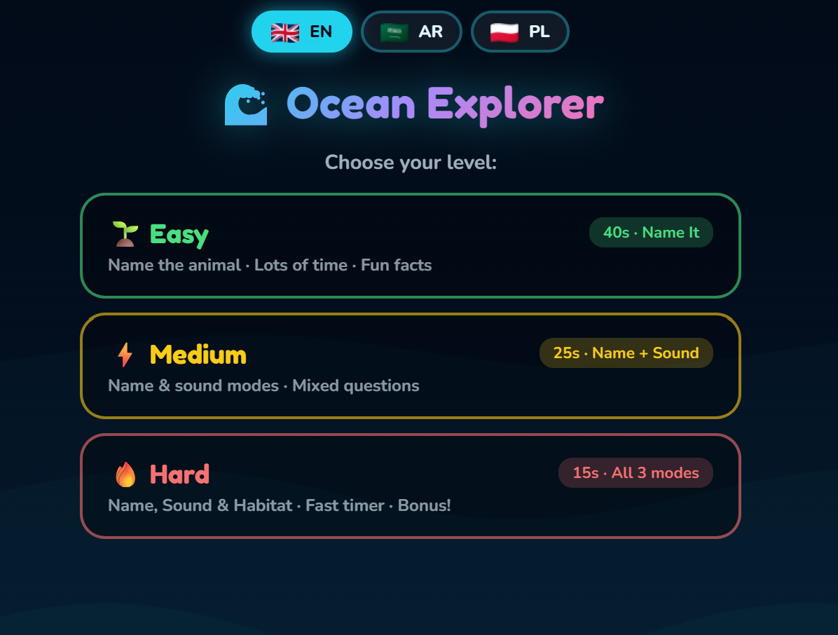 Dive into the deep sea and discover fascinating ocean creatures! Children identify animals by name, sound, and natural habitat across three distinct game modes. Perfect for ages 6–8, this game builds vocabulary, science awareness, and general knowledge about marine life. Fun facts appear after each answer, turning every round into a mini nature lesson that sparks curiosity about the world beneath the waves.