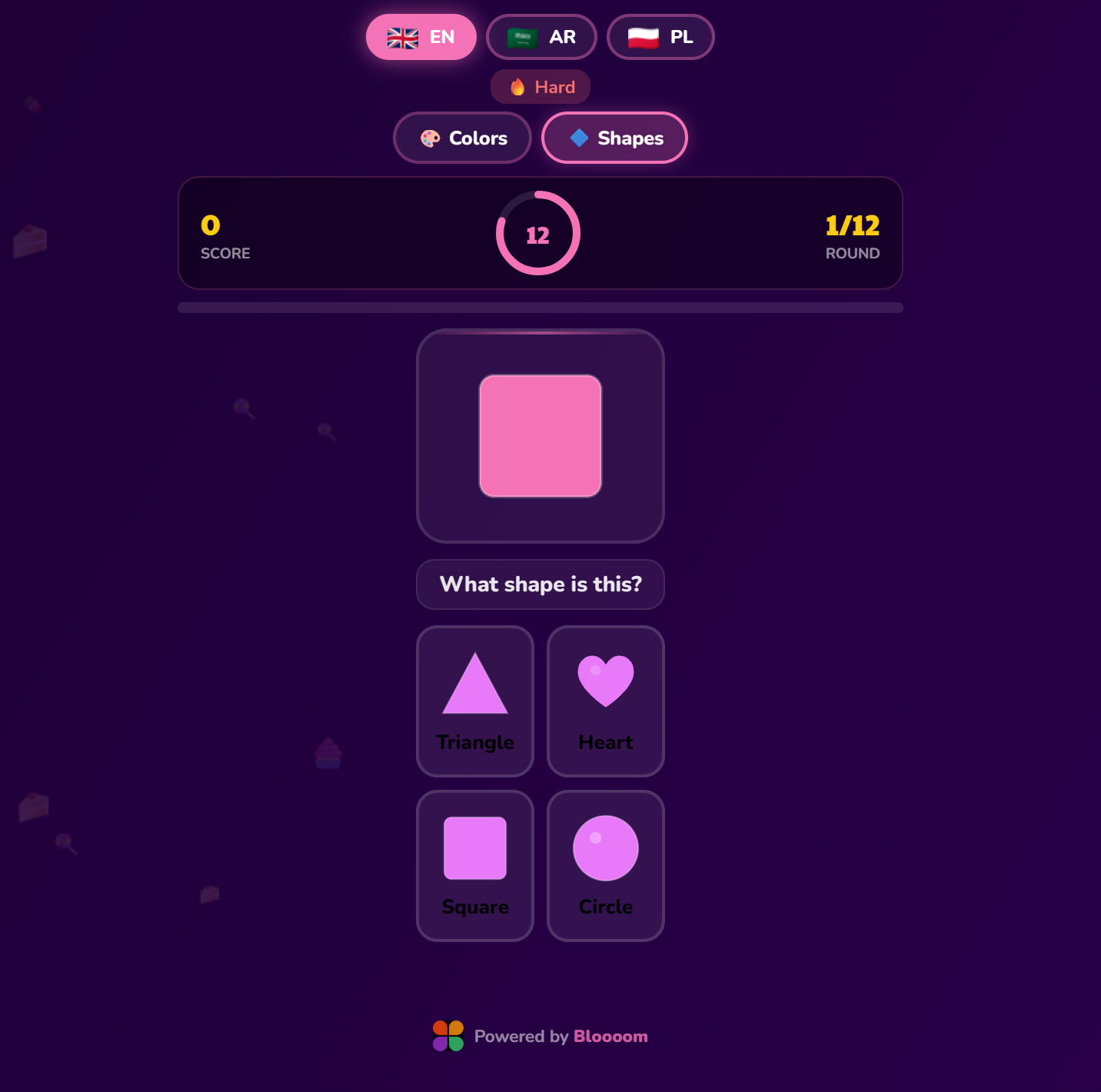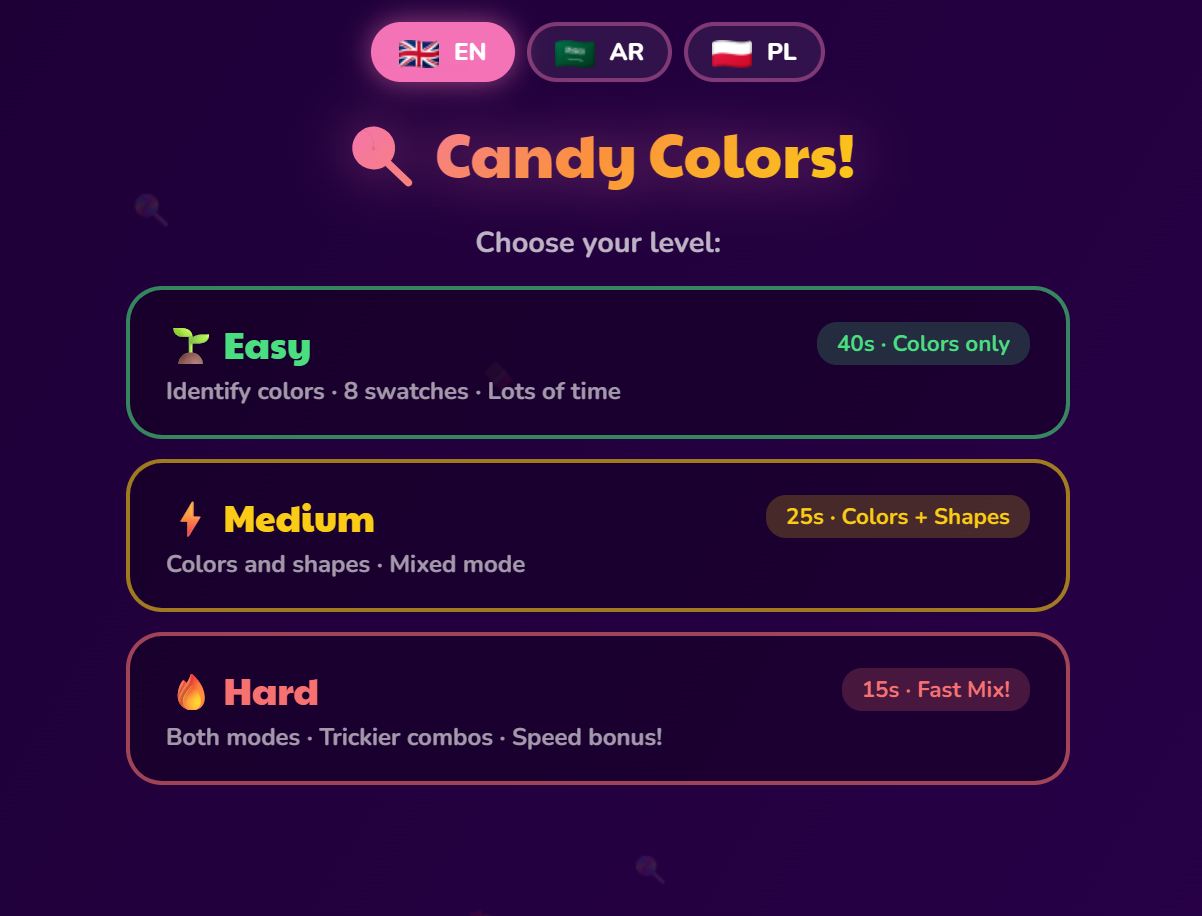 A vibrant candy-themed game where kids match colors and identify shapes in a sweet, playful world. Children learn the names of 8 colors and 8 geometric shapes through rapid-fire rounds filled with sweets, sparkles, and celebrations. Ideal for ages 5–7, it develops visual discrimination, color vocabulary, and shape recognition — essential foundations for early mathematics and art. The colorful design keeps attention and makes learning feel like a treat.