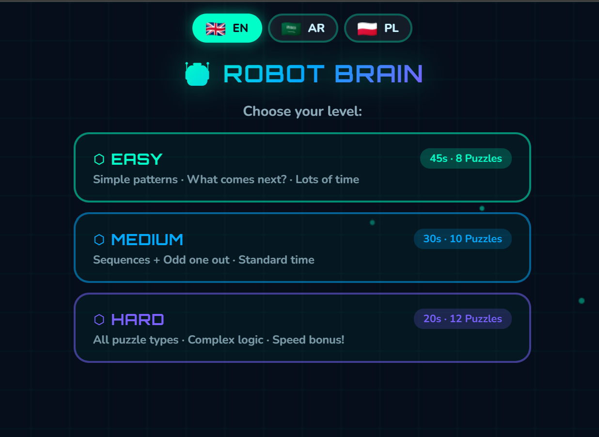 A logic and reasoning challenge where children help a friendly robot solve puzzles. Three types of brain-teasers — number sequences, odd-one-out challenges, and pattern rules — train kids to think systematically and critically. Built for ages 7–9, it develops logical thinking, pattern recognition, and analytical reasoning skills that are foundational for mathematics, science, and everyday problem-solving. Each solved puzzle unlocks a satisfying "robot approved" moment.