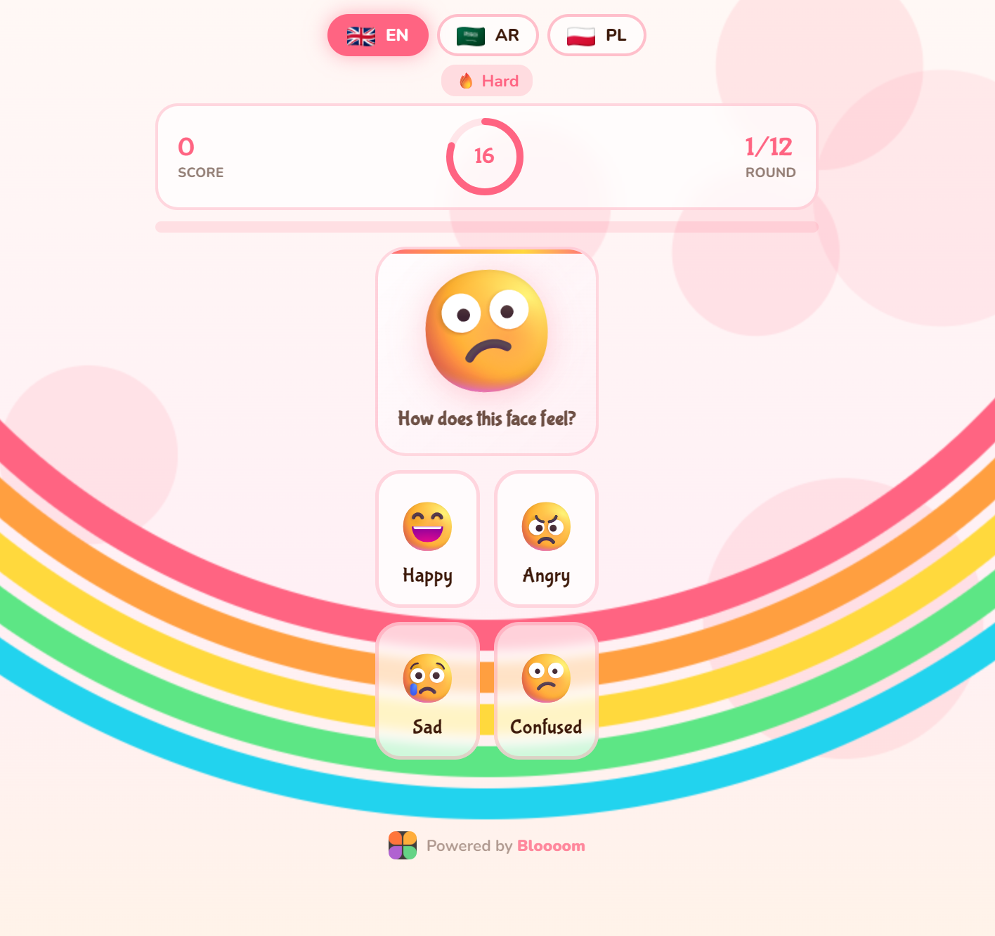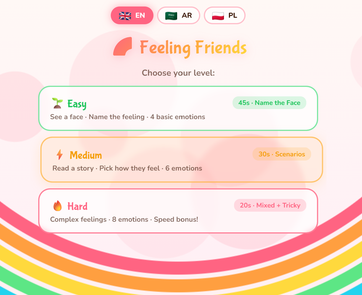An empathy-building emotional intelligence game where children identify feelings from facial expressions and story scenarios. Kids match emotions to situations and learn the names of 12 different feelings across two modes — face recognition and story scenes. Designed for ages 5–8, it develops emotional vocabulary, empathy, and social awareness. Understanding emotions helps children communicate better, manage their own feelings, and build stronger friendships.