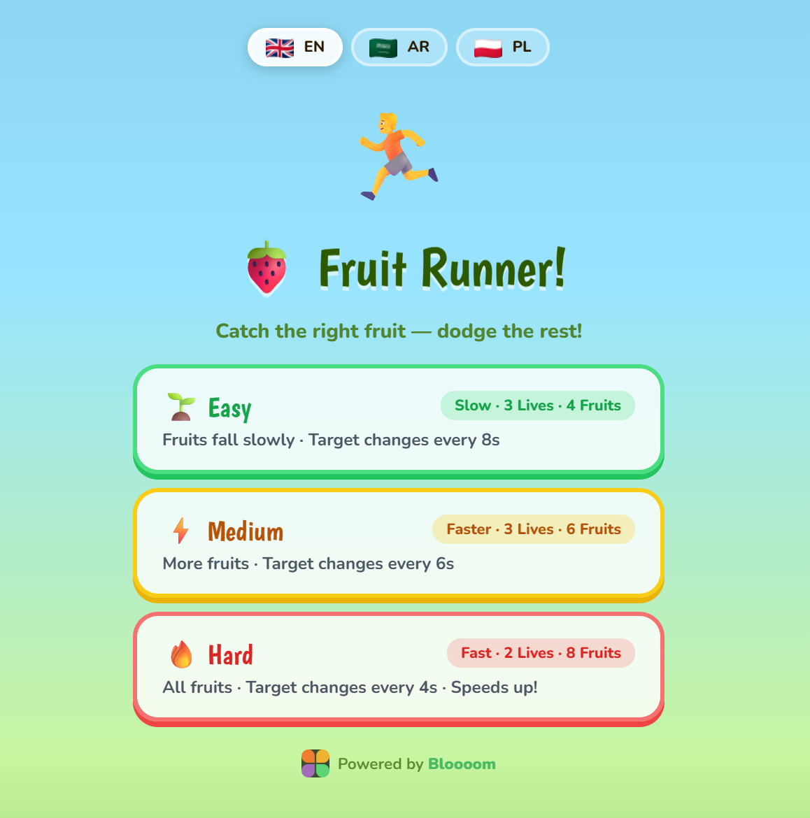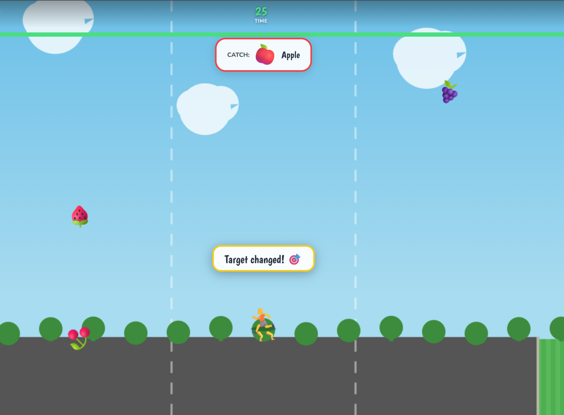 A fast-paced side-scrolling runner where children sprint down a three-lane road catching the correct fruit before the timer runs out. The target fruit switches every few seconds, training kids to read quickly, react fast, and stay focused under pressure. Catching the right fruit adds precious seconds to the clock. Great for ages 6–9, it sharpens reading recognition, reaction time, visual attention, and decision-making — all while building healthy competitive instincts.