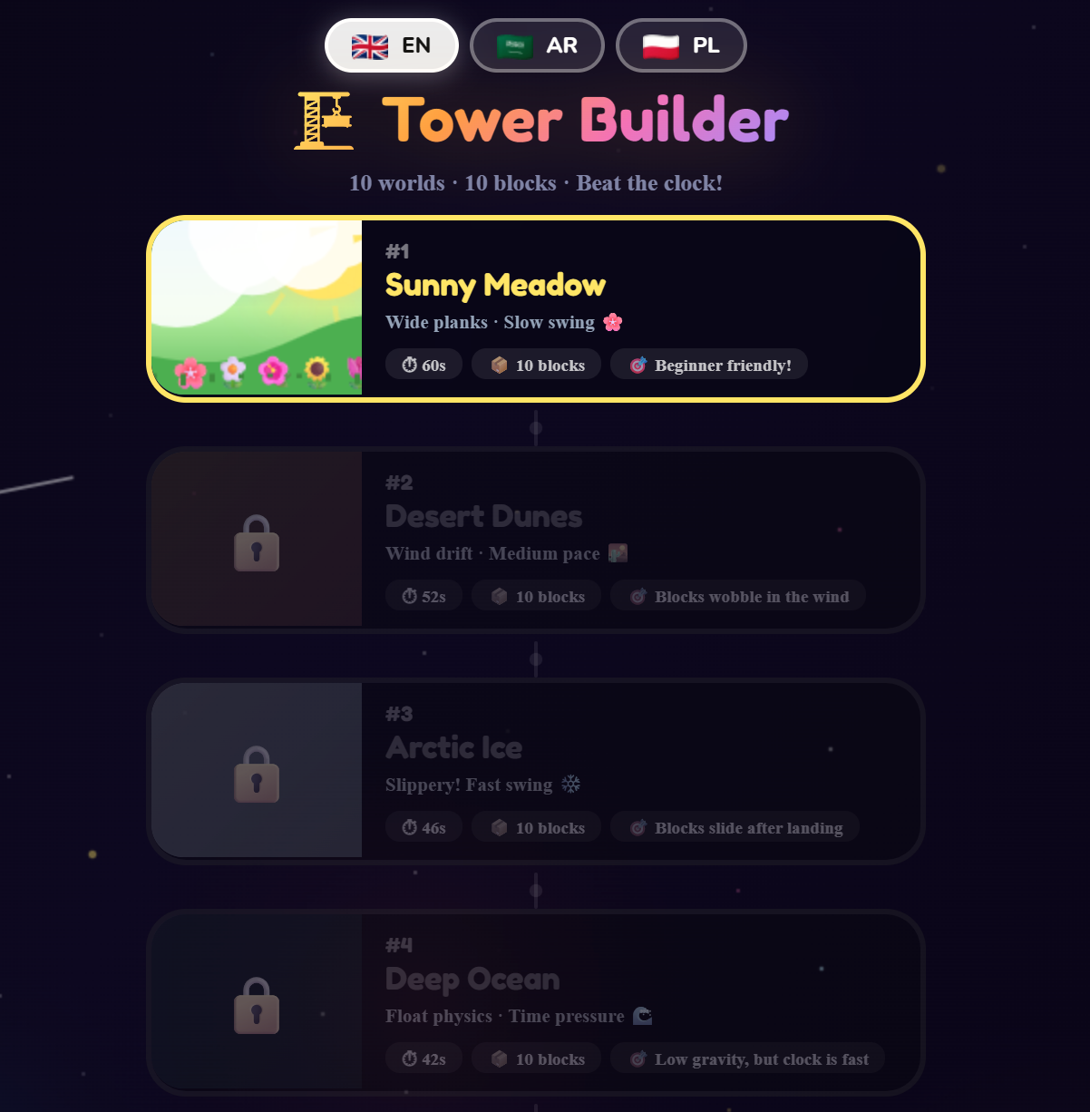 An engineering challenge across 10 unique worlds where children drop blocks to build the tallest tower possible within the time limit. Each world introduces a new physics twist — slippery ice, bouncy clouds, low gravity in space, shrinking lava blocks. Children must judge timing, alignment, and spatial positioning to stack blocks precisely. Ideal for ages 7–10, it develops hand-eye coordination, spatial reasoning, concentration, and patience — while making physics concepts tangible and fun.