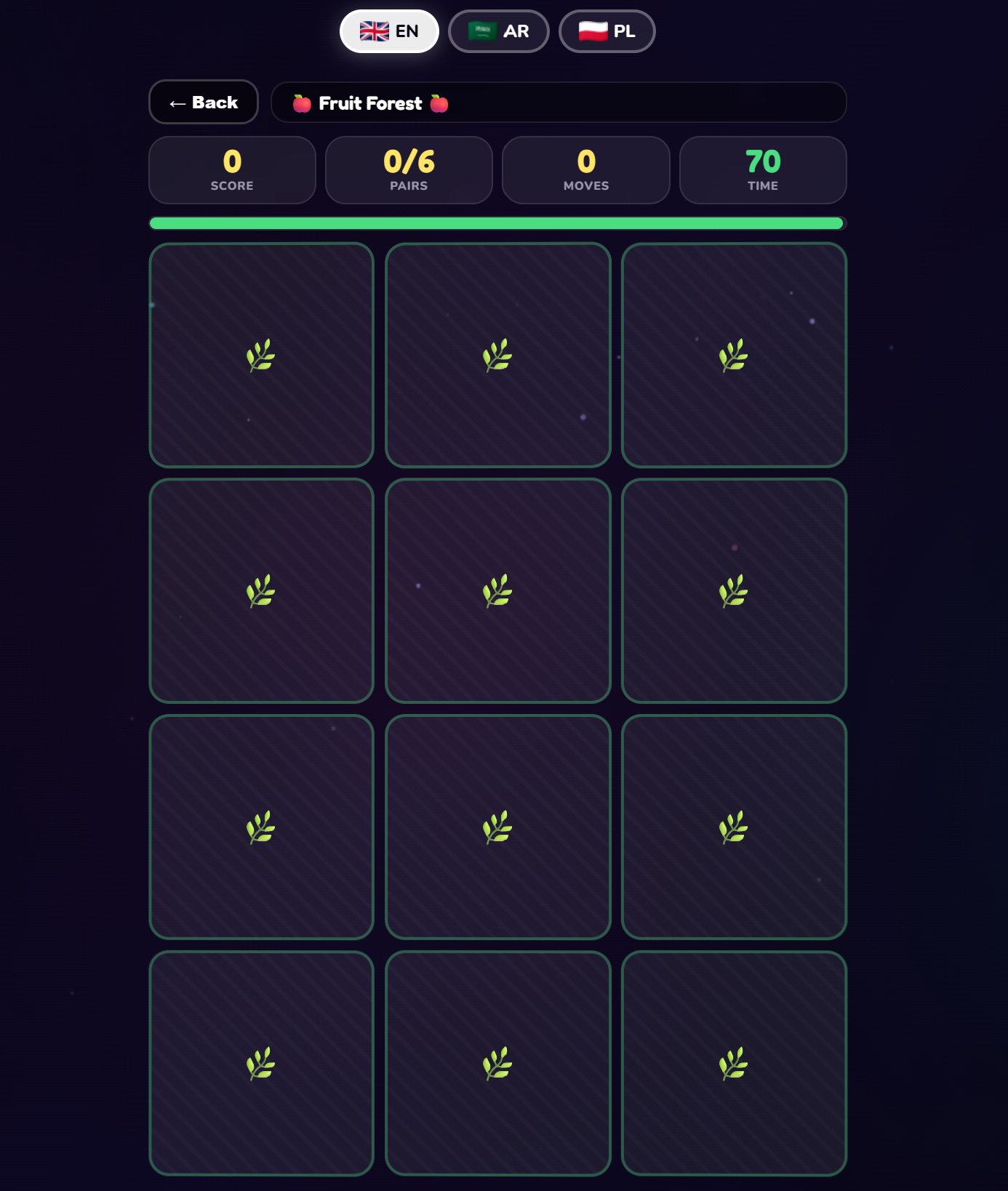 A rich multi-level memory card game where children flip cards to find matching pairs across 8 themed worlds — from fruit gardens and ocean creatures to animal sounds, number names, and color swatches. Each level starts with a brief "peek" phase to memorise card positions before the board is hidden. Designed for ages 5–9, it powerfully develops short-term memory, concentration, visual recall, and cognitive processing speed. The variety of pairing modes (same image, word-to-picture, number-to-name) ensures children are always learning while they play.
